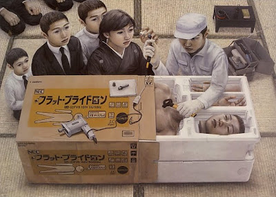 Tetsuya Ishida (born in June 1973, Shizuoka) was a talented Japanese painter. The characters in his painting appear unhappy and often their bodies are in pieces or part of some machine or other object. Tetsuya Ishida died in 2005 after being hit by a train (possibly suicide) he leaving behind around 180 works created during his 10 year art career.